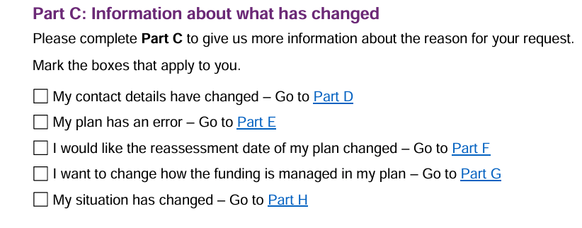 We previously discussed in our article about different situations in which you can notify the NDIS about your change of circumstances. As per your situation, in part C of the change of details or change of situations form, you can select one of the following options as shown in the snippet below.